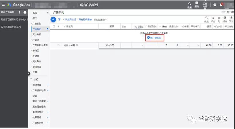 首先在拿到一个空帐户后,先要创建广告系列,点击【新广告系列】。