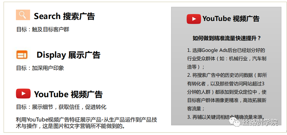 那这家企业是如何开展的线上营销,是怎样通过YouTube视频广告提升营业额的?其实呢,这家公司和我们大多数B2B企业一样,最初选择的是Search搜索广告,通过关键词触发目标客户群,让目标地区用户知道我们企业的存在,之后通过Display展示广告,以图文结合的方式加深了用户对自己公司的印象,最后呢,再通过YouTube视频广告针对行业相关用户及网站曾经的到访者进行广告投放,利用YouTube视频详细的展示了产品生产与技术操作过程,深深打动了用户,赢取了客户信赖,并通过号召性用语促使客户产生咨询。“三管齐下”相互作者用,最终打开了公司的畅销之门。