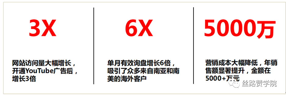 通过以上图片,大家可以看到3倍,6倍,5000万这几组数据。这是一家专注自动冲压设备,集研发、生产与销售于一体的公司,产品多用于五金制作、汽车制造等行业。产品特点呢就是回购率低,同一客户至少10年内不会有同类需求,所以回头客少,需要不断的开发新客户。这家企业呢,开通YouTube广告后,网站访问量增长了3倍,单月有效询盘增长6倍,年销售额提升至5000万元。数字很可观,大家可以畅想一下,如果我们自己网站的单月询盘能增长6倍,我们的年营业额将会是什么样子的。