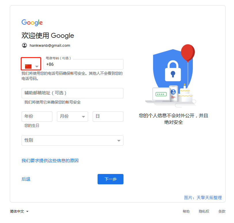 备注:中国大陆的手机号码是可以注册Google账号的,我们在上图中划线的部分选择“中国大陆”手机号码即可,按提示填写以上信息,并点击“下一步”。