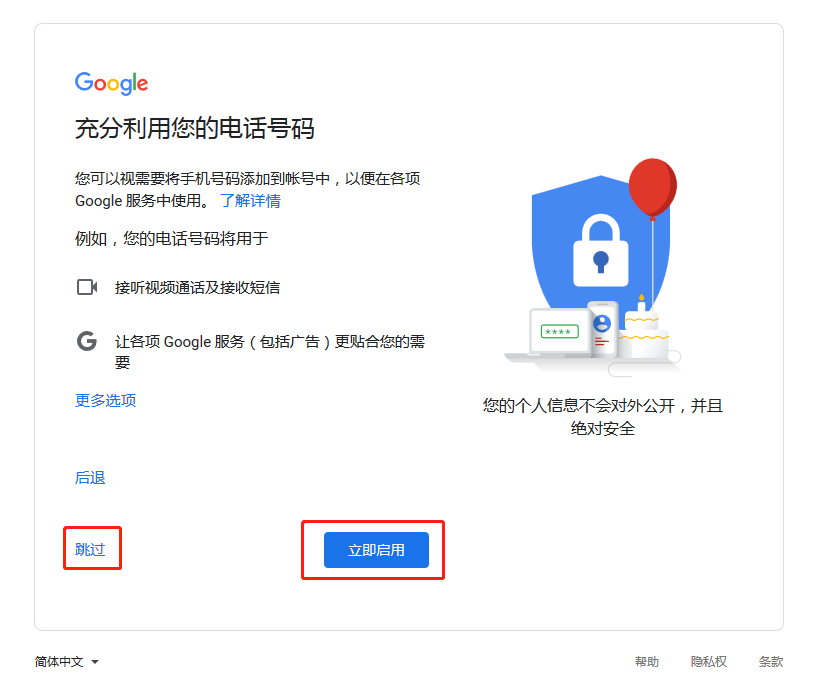 进入这个环节后,我们可以选择“跳过”或者“立即启用”,我们这里点击“跳过”之后,就进入隐私条款页面。