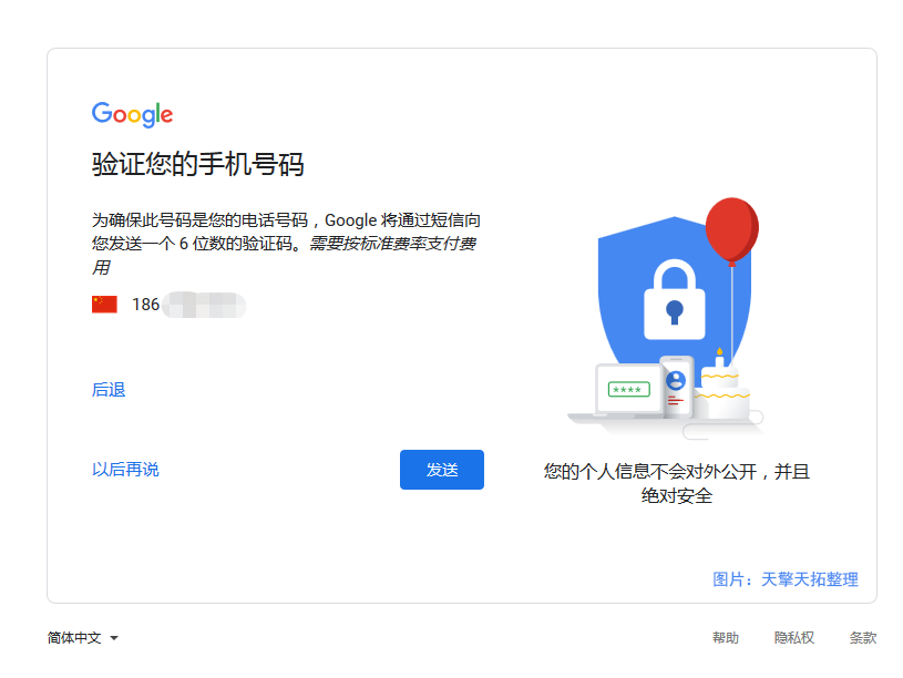 我们填写手机号码之后,Google会向我们确认手机号码,在这一步,检查手机号码没有错误之后,即可点击“发送”按钮,进行手机号码的验证。