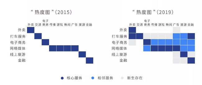将2015年互联网经济各个领域的不同公司提供的服务和内容,与2019年提供的服务和内容进行比较时,我们看到了幅色彩丰富的“热图”。一方面,各行业的参与者已经横向扩张。另一方面,这些部门的竞争也越来越激烈。