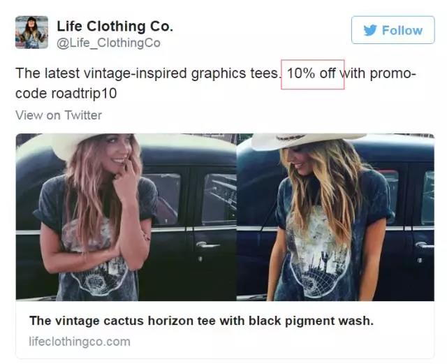 我们看到更多的人愿意点击用百分比表示折扣的推文,而不是一个直截了当标出价格的文案。20%的折扣是不是听起来不止优惠5美元呢?