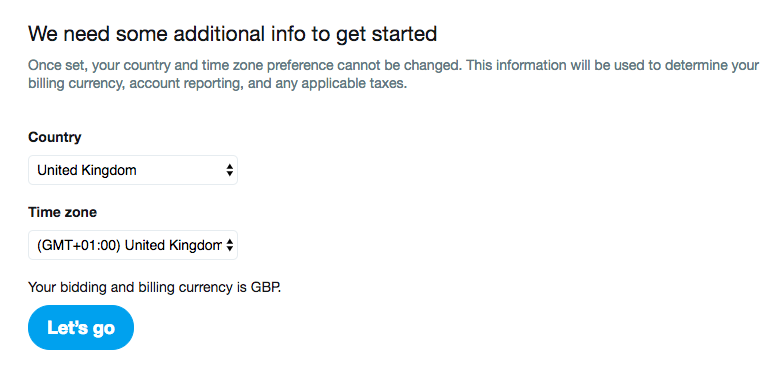 设置后,将无法更改广告帐户的国家/地区,时区和币种。请使用您的Twitter句柄在ads.twitter.com/help上提交支持票,并请求创建一个新的广告帐户。